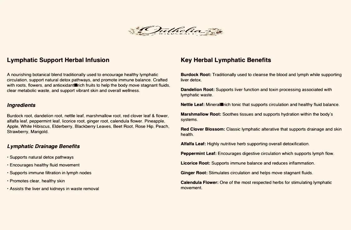 Lymphatic drainage herbal tea supports the body by stimulating the movement of lymph fluid, reducing swelling (edema), and aiding in the detoxification of metabolic waste. Using herbs like cleavers, dandelion, and ginger, these teas enhance immune function, improve circulation, and help reduce fluid retention and congestion.
